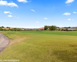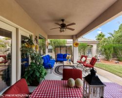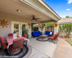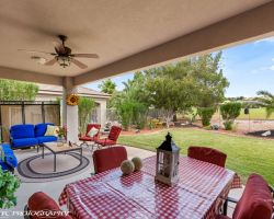 Located on the 7th Fairway of the Falcon Ridge Golf Course in the Gated Community of Mesa Hills. Mesa Hills is a 55 community known for its well manicured appearance. Since purchasing the home, the sellers have completed a beautiful remodel that includes the following: Repainted interior 2024. NEW Smoked Stainless Steel Appliances 2024. NEW painted kitchen cabinets 2023. NEW tile in entry, living room, kitchen, dining area, bathrooms and laundry room 2022. NEW plantation shutters 2021. NEW 8' glass storm door on front door. NEW carpet 2021. NEW tiled walk-in shower in main bathroom suite 2021. NEW kitchen and bathroom faucets 2024. NEW backsplash in kitchen 2022. NEW astro-turf in front yard 2023. NEW landscape rock and bushes in backyard 2023. NEW solar shade on large living room window and guest bedroom 2023. 3 Car Oversized Garage has epoxy covering on the garage floors. Beautiful east facing covered back patio offers relaxing views of golf course. You will love the welcoming atmosphere created in this backyard - all types of colorful bushes and green grass. Large lot offers room for an addition (3rd bedroom). Washer & Dryer included. Fountain excluded.