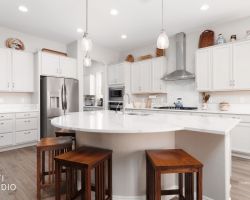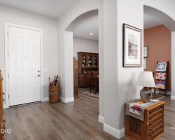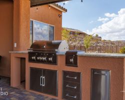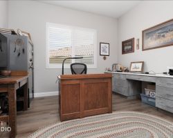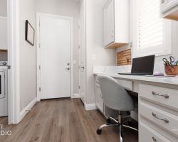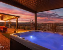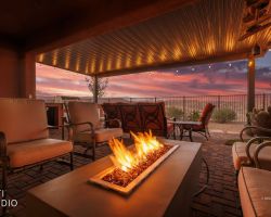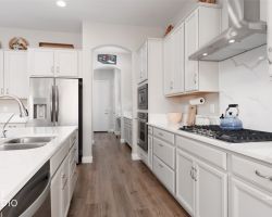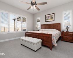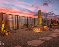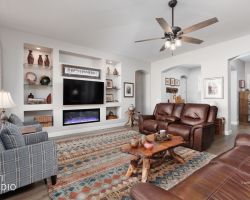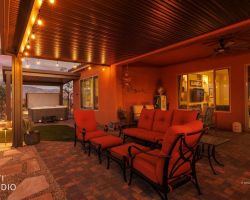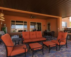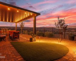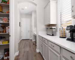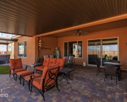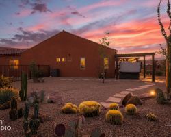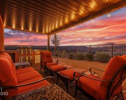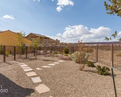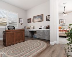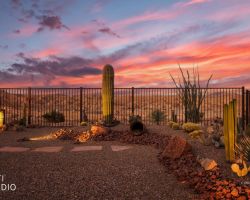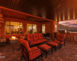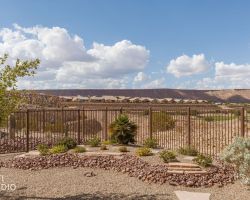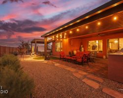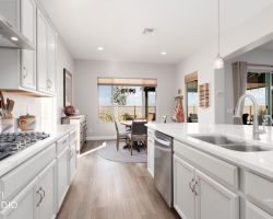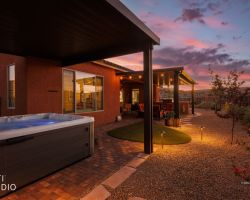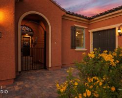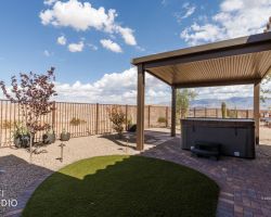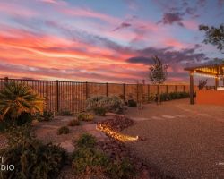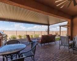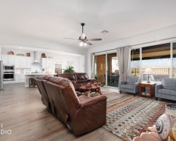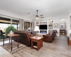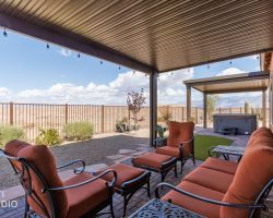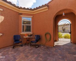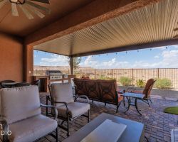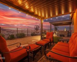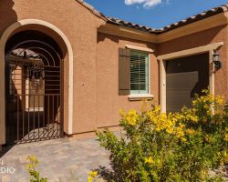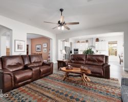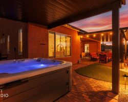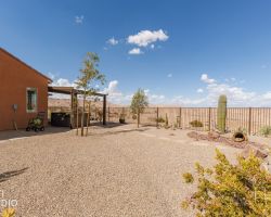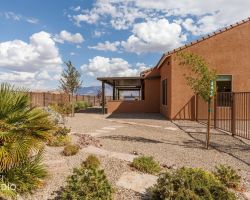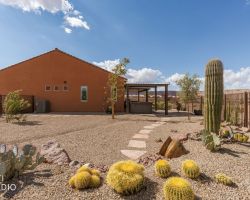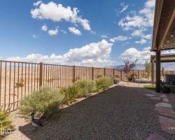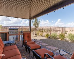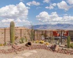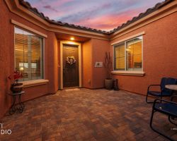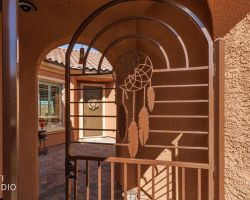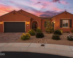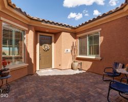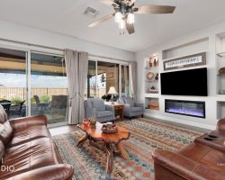 Stunning panoramic views on .27 acres! Nearly new 2BR/2.5BA den with golf cart garage. Enjoy 10' ceilings, 8' doors, plantation shutters, ceiling fans, and luxury vinyl plank flooring. Kitchen features quartz counters, RO system, semi-circular island, pull-out shelving. Butler bar and desk area with quartz countertops off the kitchen. Den includes built-in desk; great room offers media niche with fireplace and lit glass shelves. Bedrooms have ensuite baths-primary with dual vanities, tiled walk-in shower and large closet; guest with tub/shower and grab bars. Laundry room boasts ample cabinetry, work surface, and built-in ironing board. 2-car garage is climate-controlled with ceiling storage racks. No need for a trash can inside garage--includes a dedicated outdoor trash enclosure. Outdoor living shines with extended paver patio, awning, firepit, outdoor kitchen and walkway to hot tub under second awning. Landscaped yard and cacti garden glow with low-voltage lighting. Community amenities include indoor/outdoor pools and hot tubs, tennis, pickleball, bocce ball, 18-hole putting green, state-of-the-art gym, indoor walking track, clubs, activities & discounts at Conestoga Golf Club.