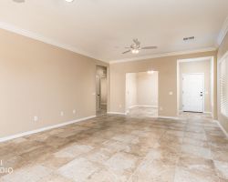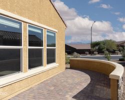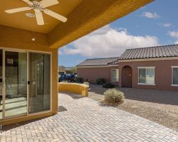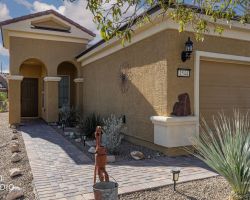 Welcome to this beautifully maintained 1,451 sq. Ft. Ranch-style home in Sun City Mesquite, offering 2 bedrooms plus a versatile den. The home features a climate-controlled garage with epoxy flooring, storage cabinets, and paver driveway/walkway for added curb appeal. Inside, enjoy tile flooring throughout the main living areas and den, with plush carpet in the bedrooms. The kitchen is a chef's delight with stainless steel appliances, granite countertops, full backsplash, and upgraded cabinetry. The laundry room includes upper cabinets and the washer/dryer set. The spacious primary suite boasts a tiled walk-in shower, double vanity, and large walk-in closet, while the guest bath offers a tiled surround bathtub. Additional highlights include blinds on all windows, seven ceiling fans, and an extended covered patio with paver flooring spanning the length of the home-perfect for outdoor living. This home has been professionally deep cleaned, with tile and grout refreshed, making it truly move-in ready. Resort-style amenities: clubhouse, indoor/outdoor pools, hot tubs, tennis, pickleball, bocce ball,18-hole putting green, fitness activities & golf & food discounts at Conestoga Golf Club