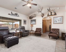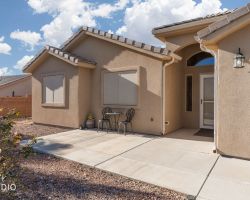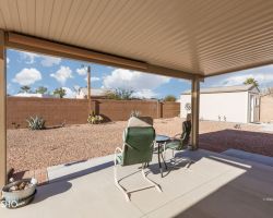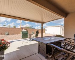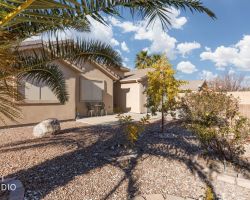 Beautiful 1,463 sq. ft., three-bedroom, two-bath home that has been thoughtfully upgraded by the current owners over the past three years. The well-designed split-bedroom floor plan offers privacy, with the spacious primary suite separated from the two guest bedrooms. The primary bedroom features a generous walk-in closet, dual vanities, a walk-in shower, and a relaxing soaking tub. The inviting great-room concept seamlessly connects the kitchen and dining area, creating a warm and welcoming living space. The kitchen is nicely appointed with natural-stained cabinetry, a new refrigerator, new electric range, and a new Bosch dishwasher. All bedrooms feature new carpet, with tile flooring throughout the rest of the home. Step outside to the backyard patio with an awning installed by Stuart Awnings-perfect for relaxing and enjoying Arizona sunsets. The fully enclosed backyard is surrounded by a cinder block wall and includes a Tuff Shed for additional storage. On the north side of the home, the RV parking area has been completely paved and can accommodate nearly any size RV, along with additional vehicles. Fully equipped with 50-amp power, water, and a dump station. NO HOA!