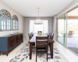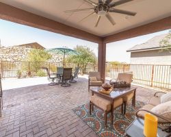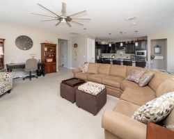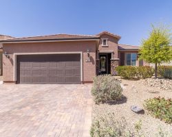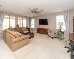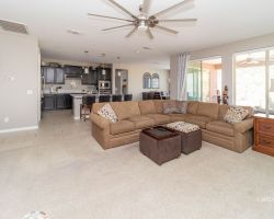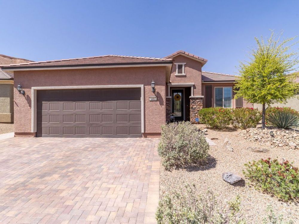 Welcome to this beautifully maintained 2-bedroom, 2 bath home with a den, 1827 square foot home located in the desirable Sun City community. This inviting home features pride of ownership, an open-concept floor plan filled with abundant natural light, creating a bright and airy atmosphere throughout. The spacious living and dining areas flow seamlessly into the kitchen with quartz countertops, stainless steel appliances and a large kitchen island overlooking the living area and covered back patio completed with brick pavers, seamlessly connecting indoor/outdoor living. The versatile den offers the ideal space for a home office, hobby room, or guest area. The fully finished garage has been extended 6 feet, creating more storage options. This home combines comfort, convenience, and style in a peaceful community-ready for you to move in and enjoy!